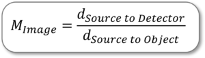 Geometric magnification of X-rays works identically to its counterpart in visible light and shadows. The magnification factor is just a simple ratio comparing the Source to Detector distance to the Source to Object distance: