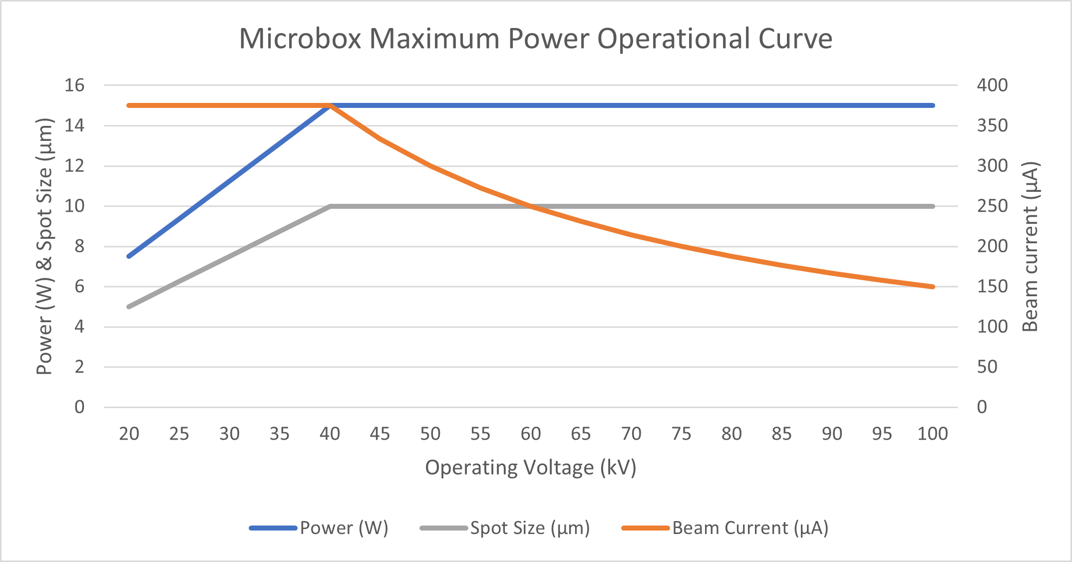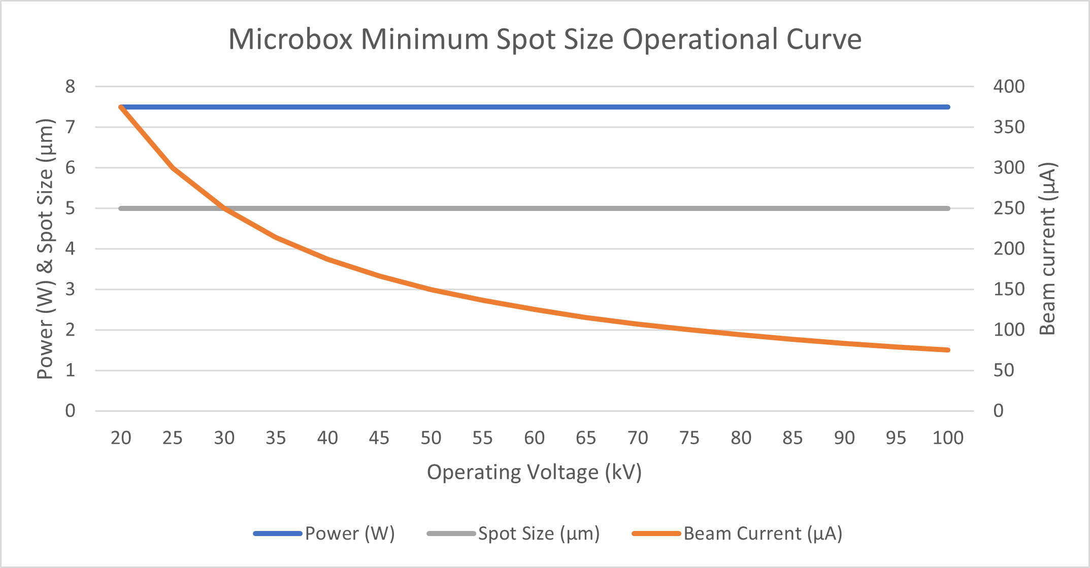 Because W is the common choice of target material for imaging applications, we’ll focus on W target sources. A safe rule of thumb for power loading on a standard W target X-ray tube is 1W/μm. Beyond 1W/μm, the spot will generate too much power for the target to handle, and the target disk will be damaged, sometimes in a matter of seconds. Micro X-Ray has developed a unique target material structure using a Diamond substrate to move the heat out of the spot and into the anode much more efficiently than a standard target structure. This allows us to run at a 50% increase in power loading compared to a non-Diamond backed target, allowing for a 1.5W/μm power loading number.